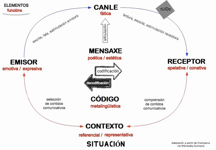 Emisor, receptor, mensaxe, código e canle, xunto co referente (realidade representada) e a situación (circunstancias do acto), constitúen o sistema de comunicación.
