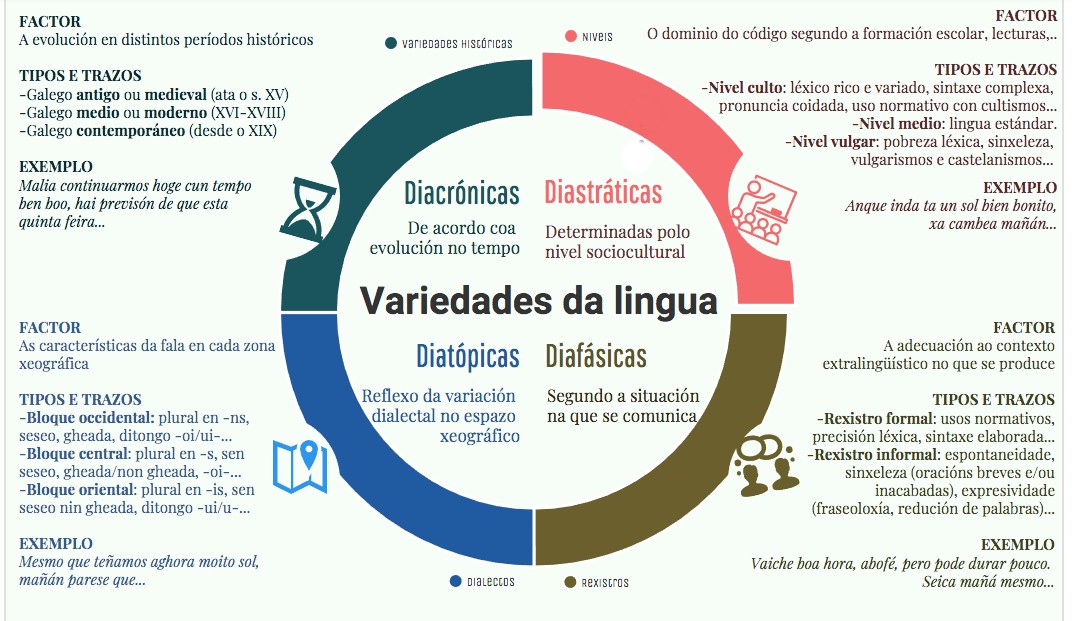 Diferéncianse os niveis de lingua (derivados de factores socioculturais, da formación) dos niveis de fala ou rexistros (determinados pola situación comunicativa e o receptor).