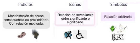 Existen diferentes tipos de signos de acordo con múltiples criterios, caso da relación co referente, que permite distinguir indicios, iconas e símbolos.