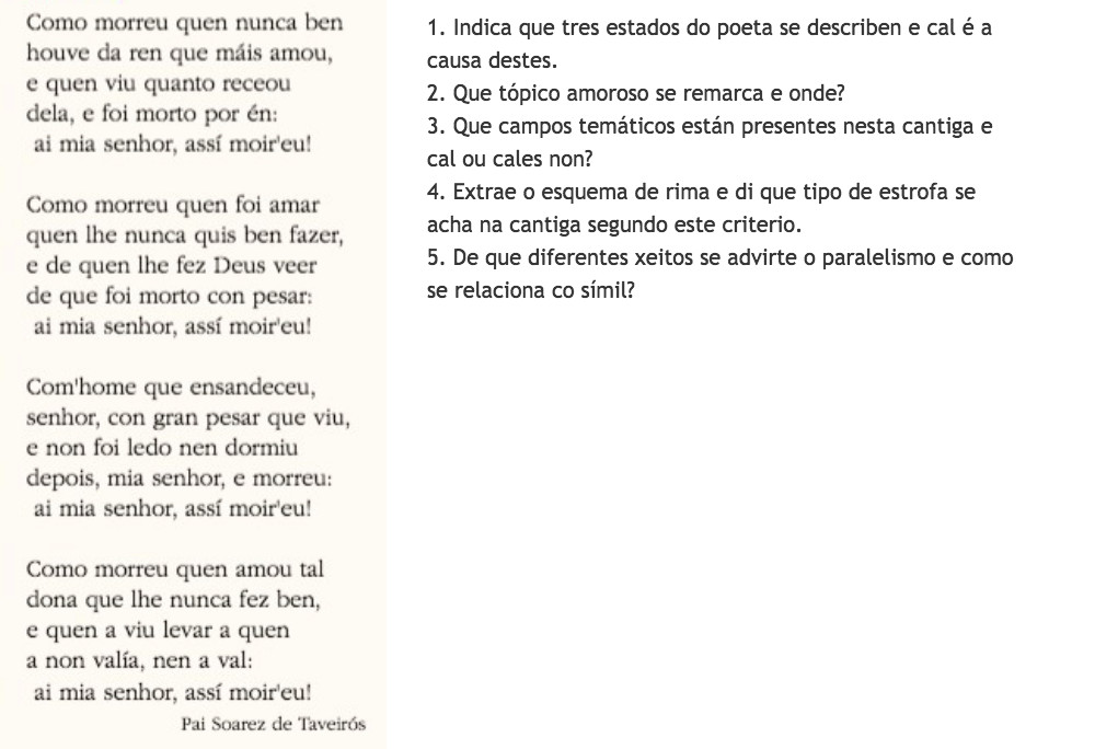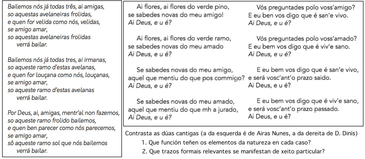 - antíteses (pois meu mal é quanto ben vós havedes).