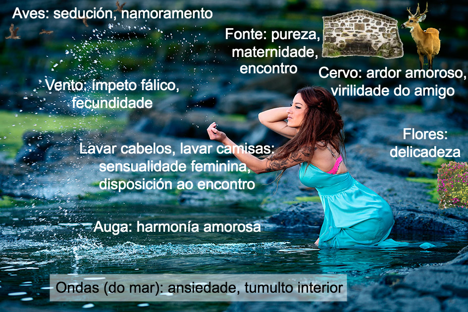 Así, a auga representa a fecundidade, o cervo é o namorado viril, o mar revolto transmite a paixón amorosa, etc.