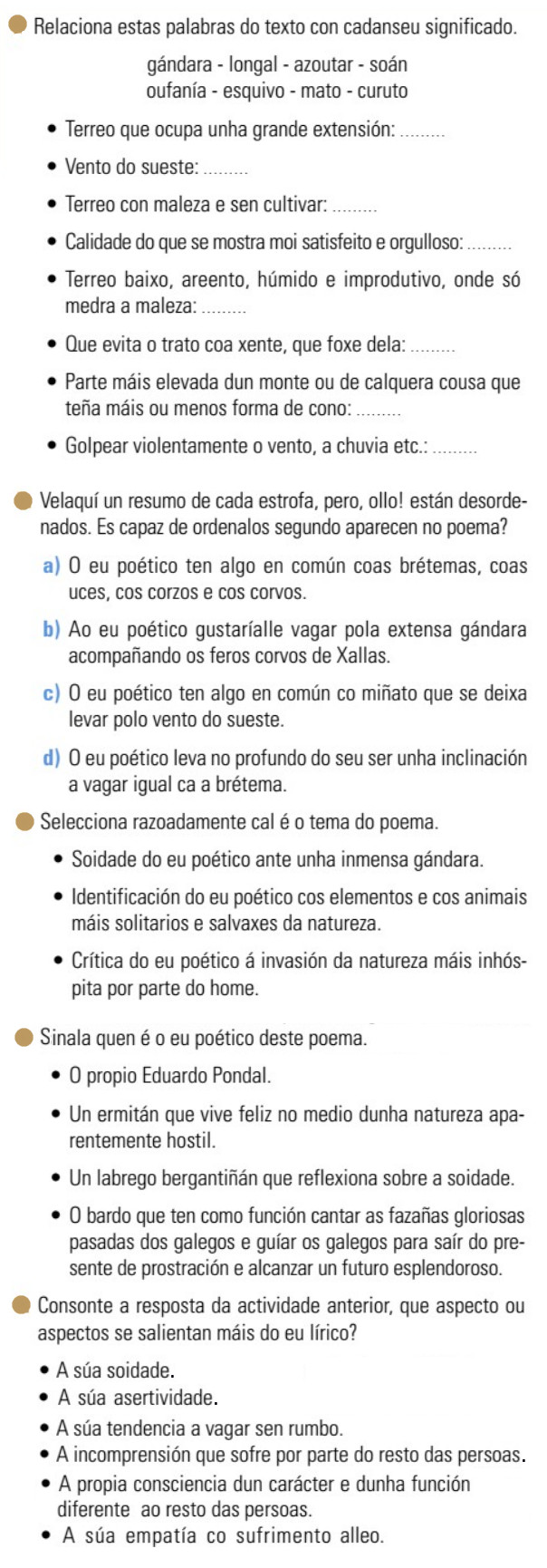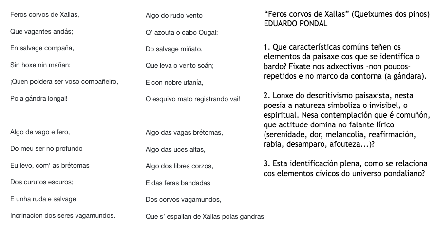 1. Sexa desde o amor romántico, sexa desde a paixón naturalista, o sexismo e a misoxinia atravesan as mostras das “relacións amorosas” na obra pondaliana, o que desemboca na obxectualización da muller. Como se advirte esa concepción neste texto? Repara na idealización e redución do que representa a muller, na suxestión dos versos 7 e 8... 2. Nesa liña, que representan os versos plenamente paralelísticos? |
