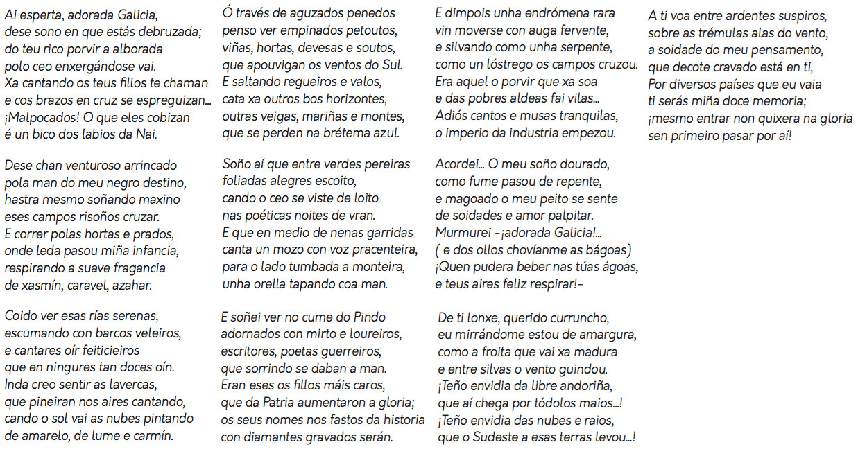 - As 32 composicións da edición definitiva, de 1886, están encadrados entre a "Introdución", texto no que xustifica o emprego do galego, e unha "Encomenda" final que asenta o seu lirismo cívico.