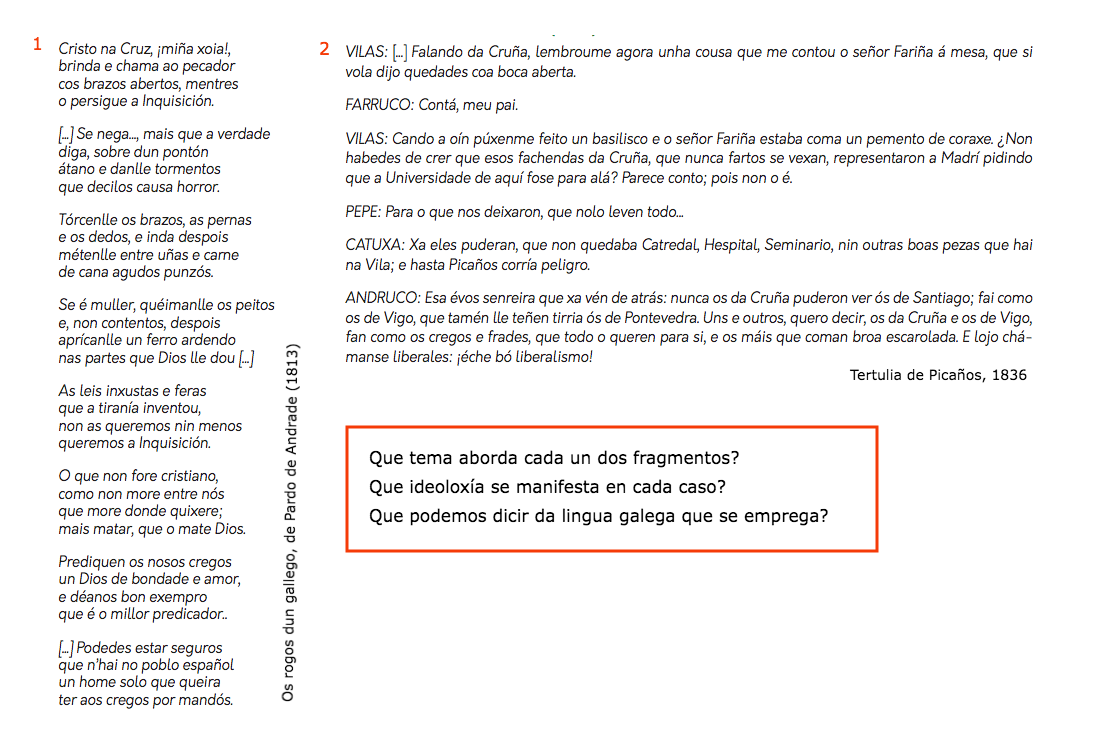 3. Na primeira fase do Prerrexurdimento (ata 1836) publícanse escritos en galego de carácter ideolóxico e propagandístico en relación con dous feitos históricos: a invasión francesa e a pugna entre liberais e absolutistas.