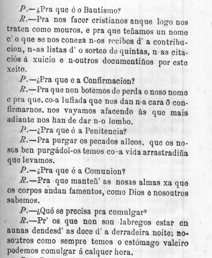 A pugna ideolóxica está presente en Os rogos de un gallego (1813) -un poema longo do crego Manuel Pardo de Andrade no que se denuncia a Inquisición- e en varios diálogos e faladoiros, en xeral anónimos, entre os que destaca a ”Tertulia de Picaños”, de 1836.