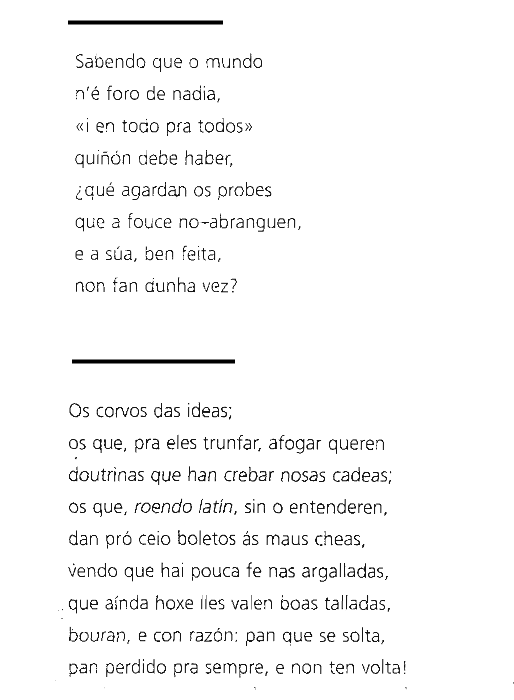 - Nas partes da lírica solitaria (Vaguedás, Do íntimo) tamén se achan críticas ao machismo, ao clasismo ou á intransixencia da Igrexa, así como a mostra das consecuencias da violencia institucionalizada (en "A xusticia pola man").