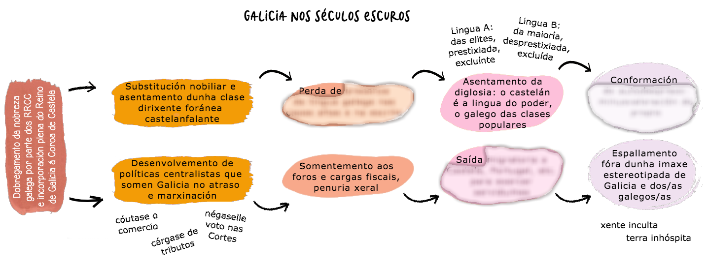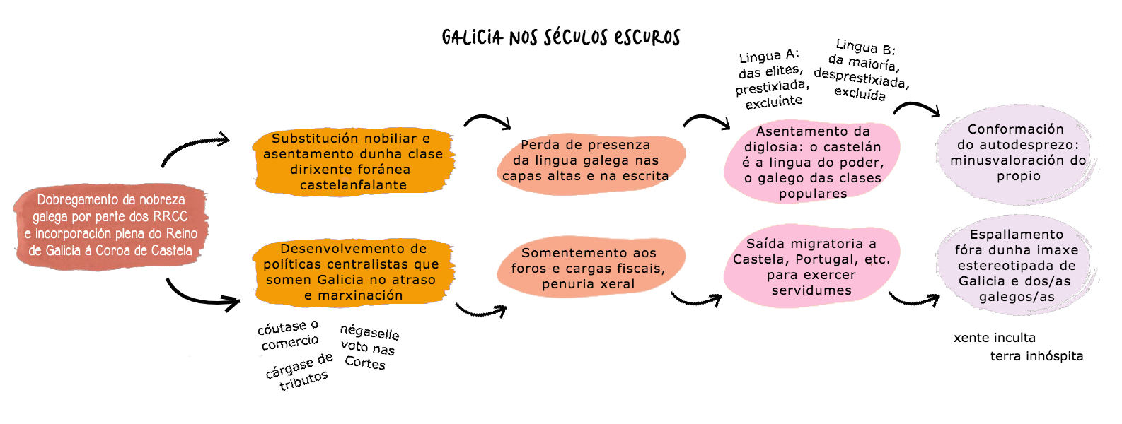A decadencia sociopolítica e a conseguinte "escuridade" no prestixio e uso formal e escrito da lingua derivan da substitución nobiliar imposta polos Reis Católicos a finais do s. XV. A clase dirixente, tanto civil como eclesiástica, será agora en boa parte de orixe castelá e arrombará o galego dos usos cultos.