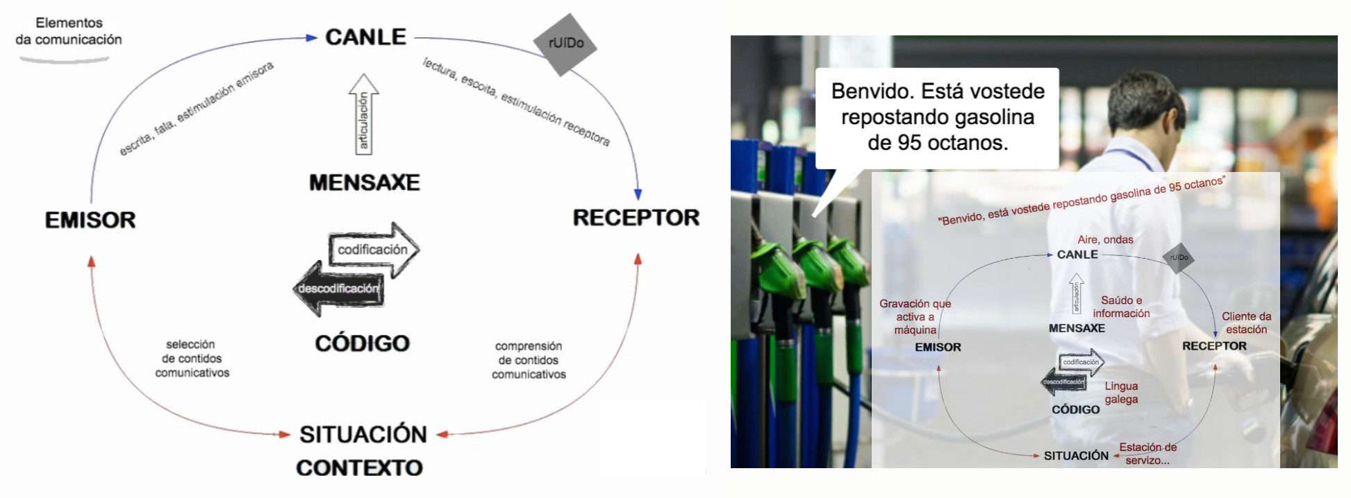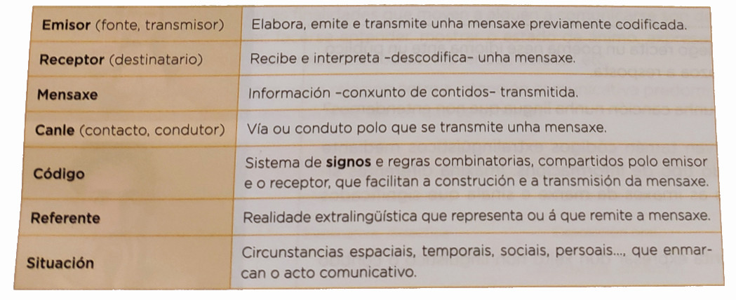 Emisor, receptor, mensaxe, código e canle, xunto co referente (realidade representada) e a situación (circunstancias do acto), constitúen o sistema de comunicación.