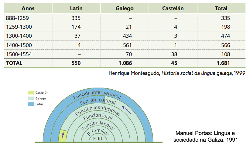 - Nos séculos XIII, XIV e XV o galego (galego-portugués) foi substituíndo o latín na escrita ata converterse na lingua de uso común nos máis diversos ámbitos da sociedade galega (e portuguesa). Así, temos: