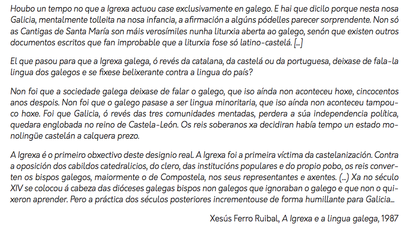 1. Concreta as etapas ás que se refire Ferro Ruibal e sintetiza a situación da Igrexa en relación coa lingua.