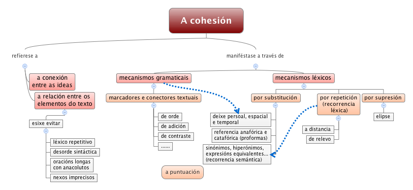 A cohesión agrupa os mecanismos (léxicos e gramaticais) que relacionan as partes dun texto. Atinxe á referencia entre termos e á conexión das ideas.
