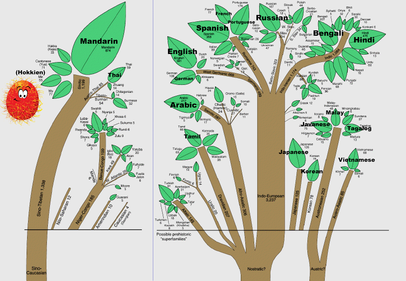 As familias indoeuropea e sinotibetana, cunhas 700 linguas entre ambas, representan case o 75% da poboación mundial (máis de 4.000 millóns de falantes).