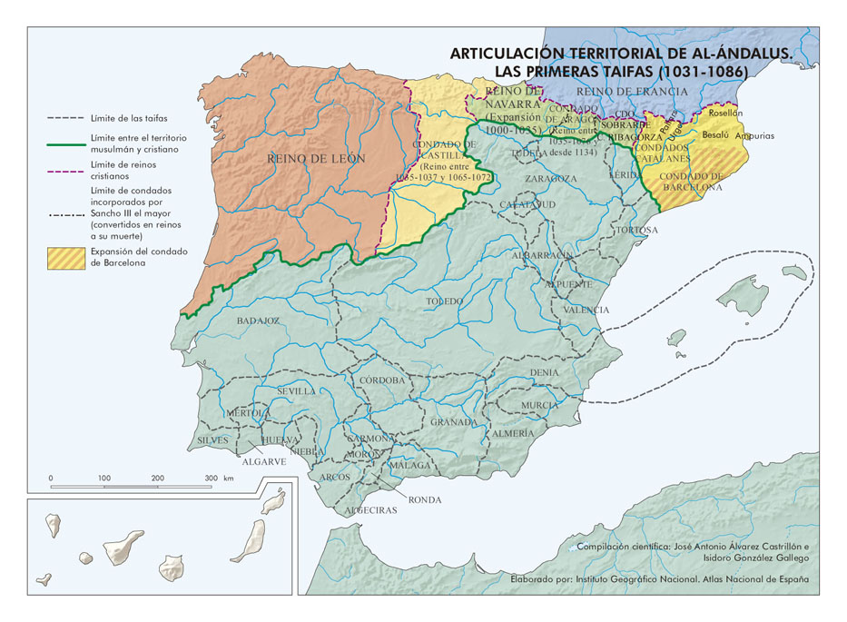 Denomínanse así os reinos nos que se disgregou o califato de Córdoba trala súa desaparición en 1031. Configuráronse máis de vinte reinos de taifas, sendo as máis importantes as de Sevilla, Toledo, Badaxoz... Tras unha primeira época de estabilidade e prosperidade, e a pesar da axuda de almorábides e almohades, foron incapaces de frear o avance dos reinos cristiáns. Desde mediados do século XIII só sobrevivirá o reino de Granada. | |