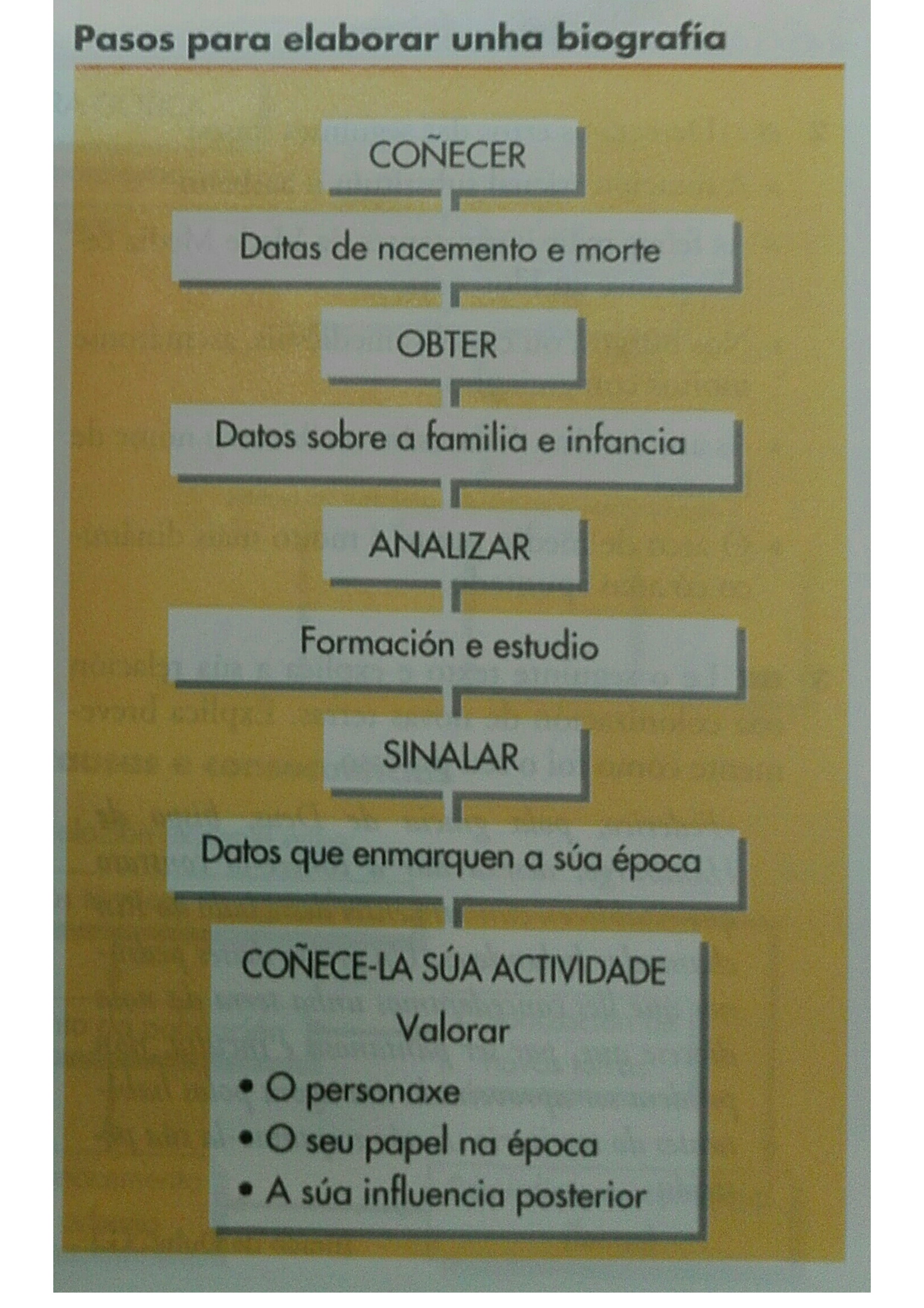 9. Determinar como vas redactar a biografía: Unha vez que reuniches a información e a analizaches, é a hora de poñerse ao choio. Podemos redactar a biografía de dúas maneiras: narrando a vida do personaxe en orde cronolóxica ou ben seleccionando tan só aqueles aspectos que nos resultaron de especial interese para o tema que estamos a estudar.