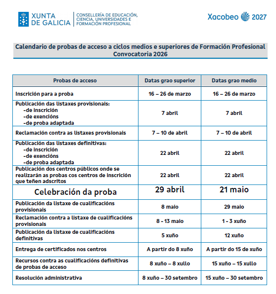 Prazo de inscrición na proba substitutiva do requisito de titulación para acceso a GRAO MEDIO e/ou na proba específica de grao medio: ata o 25 de xuño