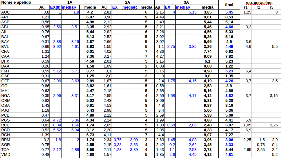 Están en azul as notas e as medias da recuperación. As notas que aparecen ao final da táboa debaixo de "recuperacións" como r1, r2 e r3 son as notas dos exames sen ponderar en cada avaliación. Non sei se mañá conseguirei ir ao instituto... se alguén ten moito interese en ver o seu exame que me envie un correo.