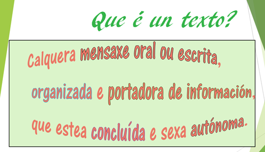 -Tipos de texto segundo a intención comunicativa (narrativo, descritivo, expositivo, argumentativo...), segundo a canle de transmisión (orais e escritos) e segundo o tema (literarios, humanísticos, técnico-científicos, periodísticos, publicitarios, xurídico-administrativos...).