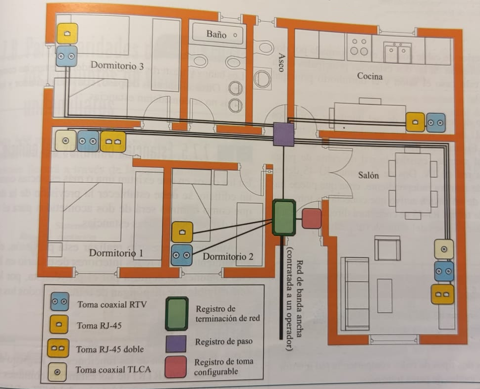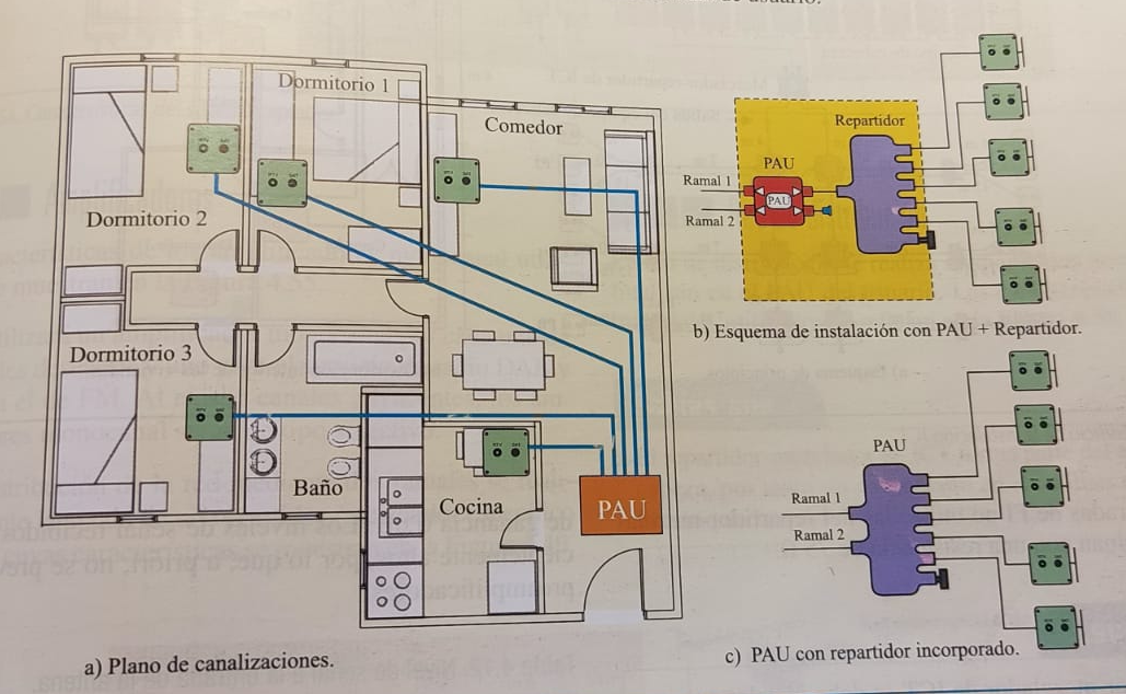 - Instalación de datos e telefonía. Asumir servicio de datos por fibra e telefonía VOIP. Planificar a instalación augas abaixo do ONT con cable Ethernet CAT6 (tanto para datos como para telefonía) e dous puntos de acceso inalambricos alimentados mediante POE. Para simplificar a instalación empregar rosetas dobles (datos + telefonía).
