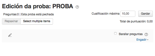 Nesta tarefa imos ver de engadir unha proba. Podes acceder ao VÍDEO se ves que tés algunha dificultade á hora de desenvolver a tarefa. No vídeo explícase de forma xeral a configuración dunha proba, non serve como guía para facer esta tarefa. Traballaremos coas preguntas que creaches anteriormente.