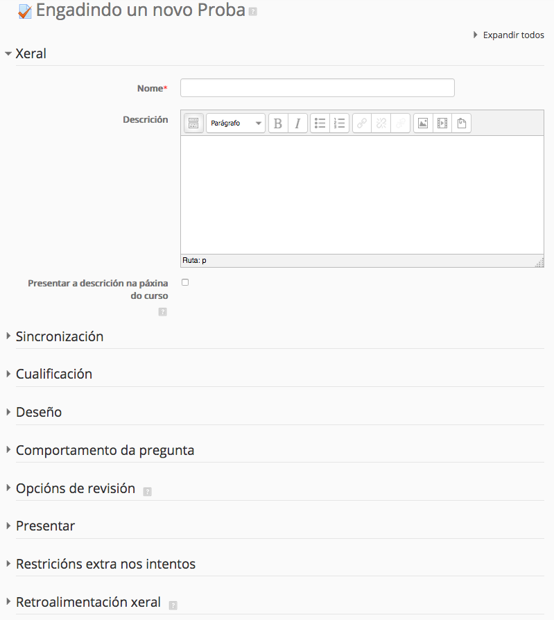 - No despregable "engadir unha actividade ou un recurso", selecciona "Proba". Ábrese unha nova pantalla. Na sección Xeral, hai un recadro, debes de enchelo xa que é obrigatorio. Dálle o nome de PROBA a túa proba.