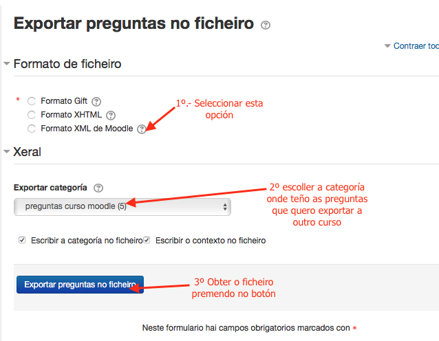 Respondiendo a tu pregunta, tengo que decirte que sí se puede. Simplemente tienes que ir al desplegable de "banco de preguntas" y seleccionar "exportar". Se abre la pagina que te muestro y exportas. Obtendrás un fichero que posteriormente deberás importar en el curso que te interesa. También puedes el fichero que has obtenido pasarselo a un compañero para que pueda incorporar tus preguntas a su curso.