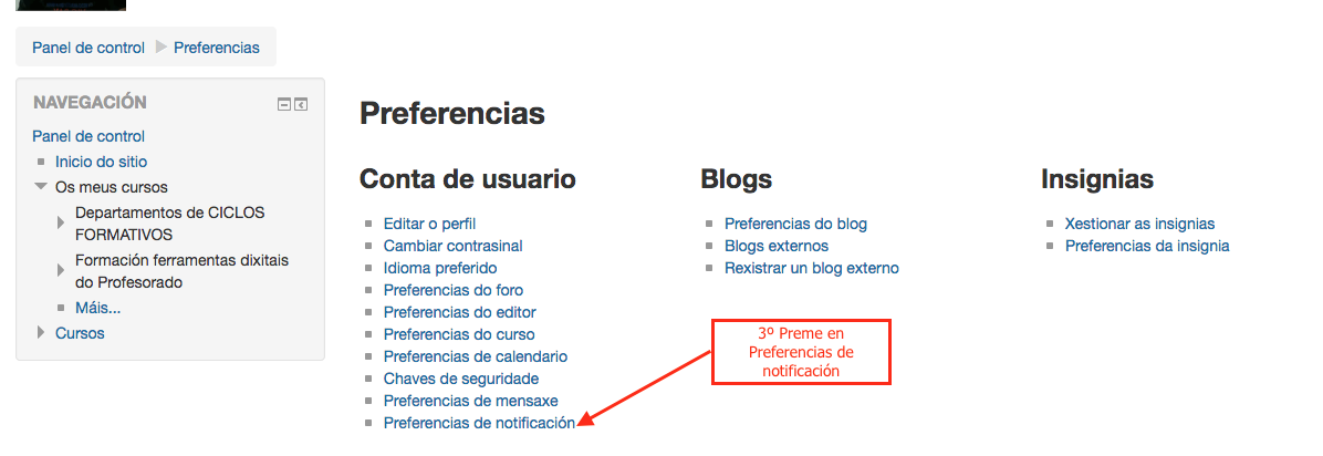 Unha vez se abre esta páxina na columna de "Conta de usuario" buscamos Preferencias de notificación e prememos sobre ela.