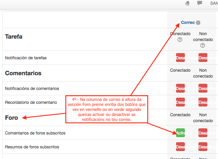 Nesta páxina podes activar ou desactivar os cadros en función de se queres recibir notificación ao correo. Podes desactivar calquera notificación.