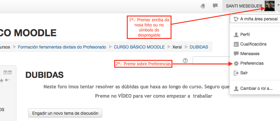Cando esteamos identificados no Moodle só temos que ir a parte superior dereita da páxina e premer na nosa foto e abrirase un despregable.