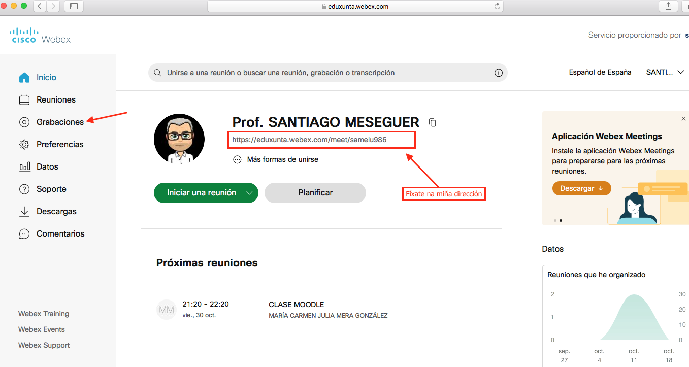 Después de visualizar los vídeos de webex y de preparar una reunión, me he fijado que en tus vídeos, a la izquierda, aparece una pestaña que pone "Grabaciones" pero en mi pantalla no aparece (te mando captura) y quería saber por qué.