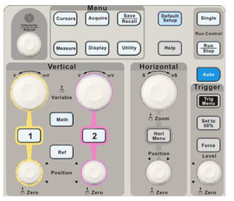 2) Centrar os eixes vertical (tensión) e horizontal (tempo) cos seus respectivos controis 'Position' (pulsar para centrar automáticamente en cero).