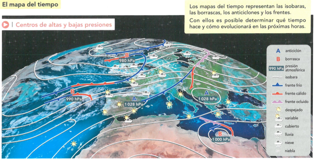- Descripción: señalar dónde están los anticiclones, borrascas y frentes del mapa del tiempo.