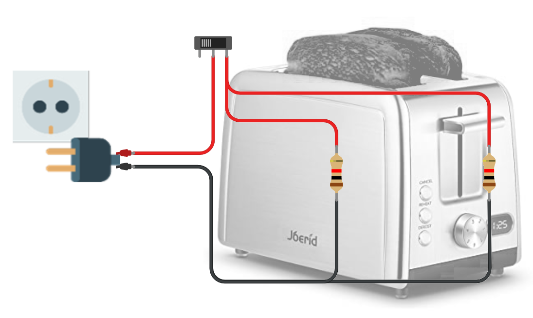 interruptor. Lógicamente, sólo si el interruptor está conectado la corriente puede avanzar. Así, la corriente llega a las resistencias, una para cada tostada, calculadas para que se pongan al rojo vivo al pasar gran cantidad de cargas y alcanzar la temperatura perfecta para dorar el pan. Eso