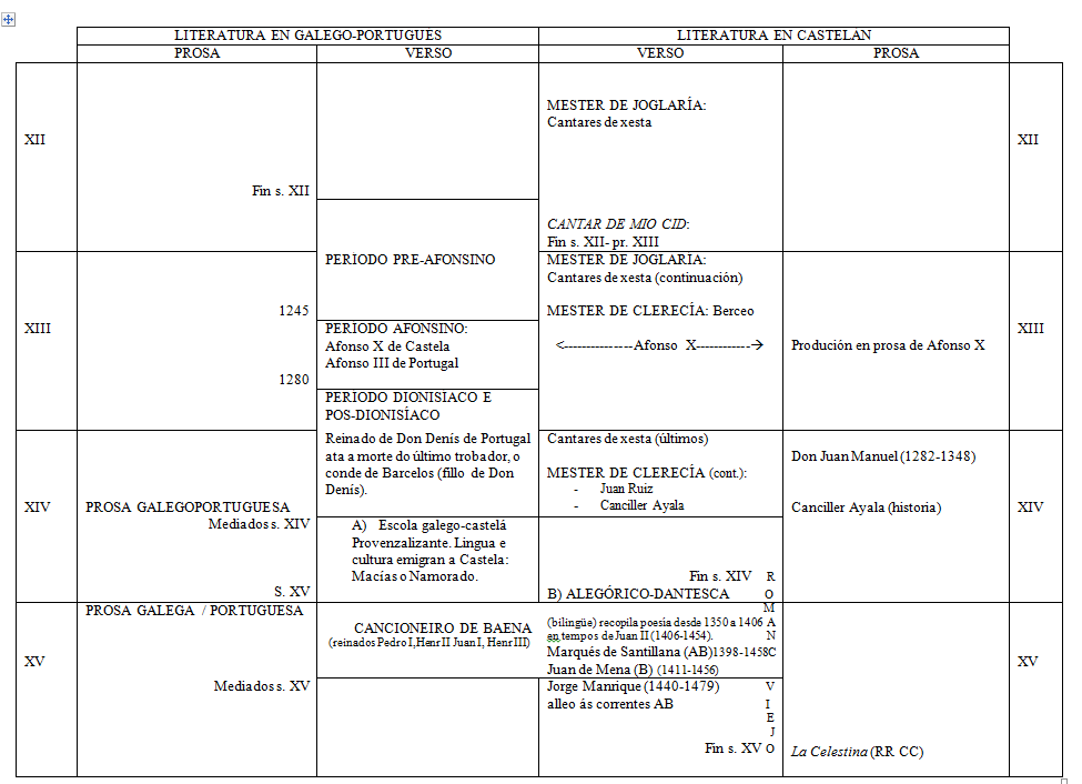 Cadro lírica-prosa medieval (en galego-portugués/en castelán).