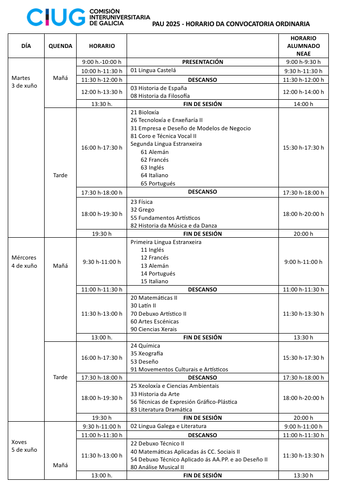 DATAS E HORARIOS PAU 2025 (CONVOCATORIA ORDINARIA DE XUÑO)