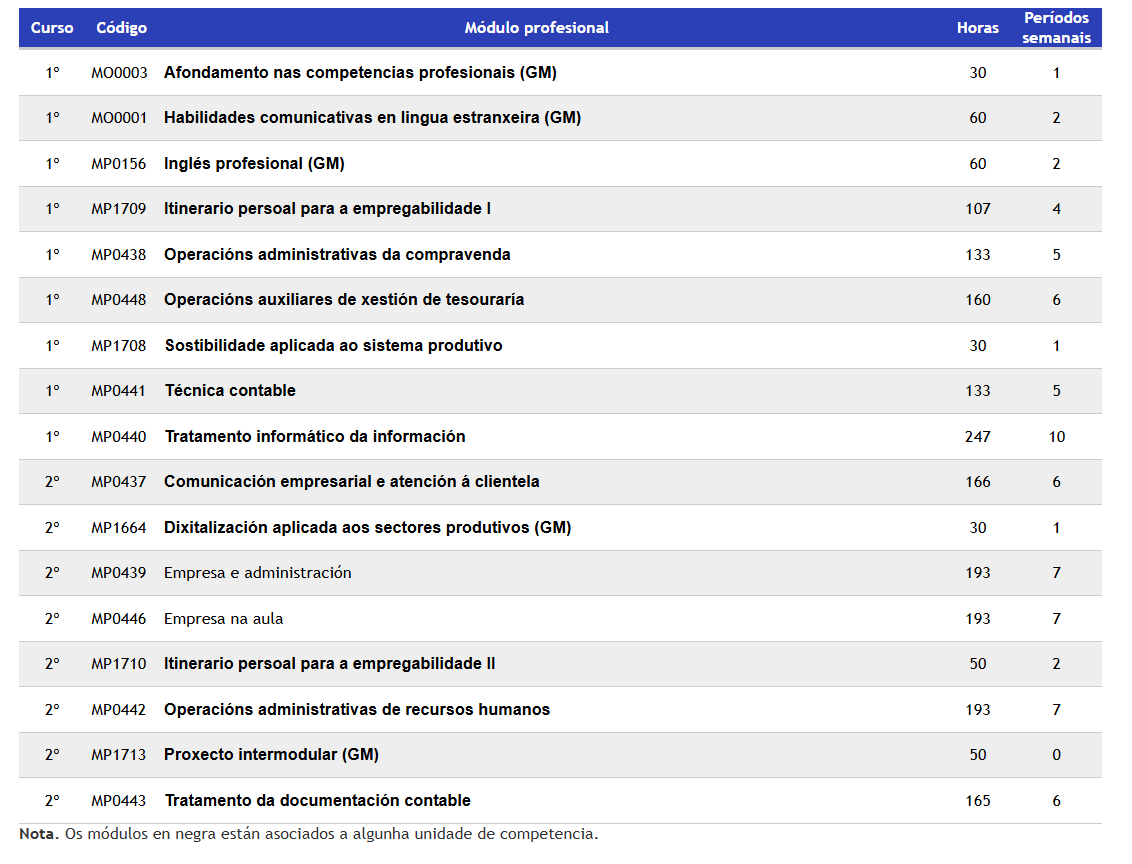 Os módulos que inclúe o CS Administración e Finanzas e os seus períodos semanais son os seguintes: