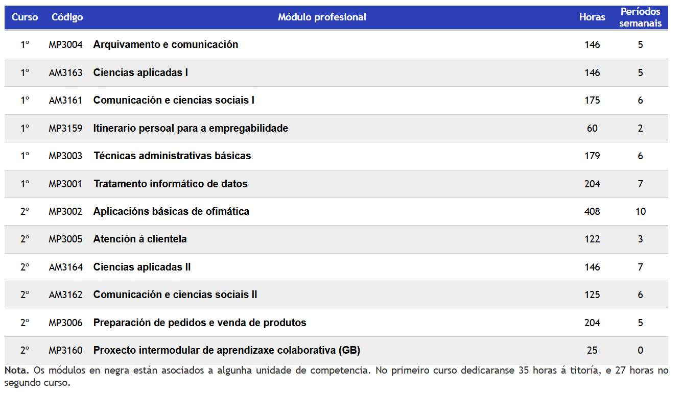 Os módulos que inclúe o CB en Servizos Administrativos e os seus períodos semanais son os seguintes:
