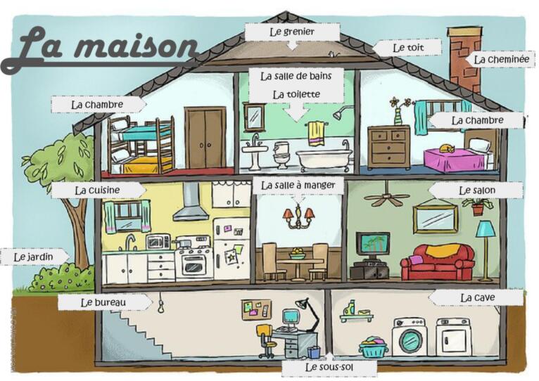 Vocabulaire: le salon, la cuisine, la salle de bains, le lit, l’armoire, le bureau, la porte, la fenêtre,...