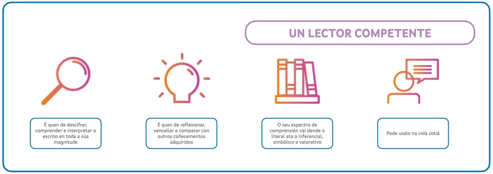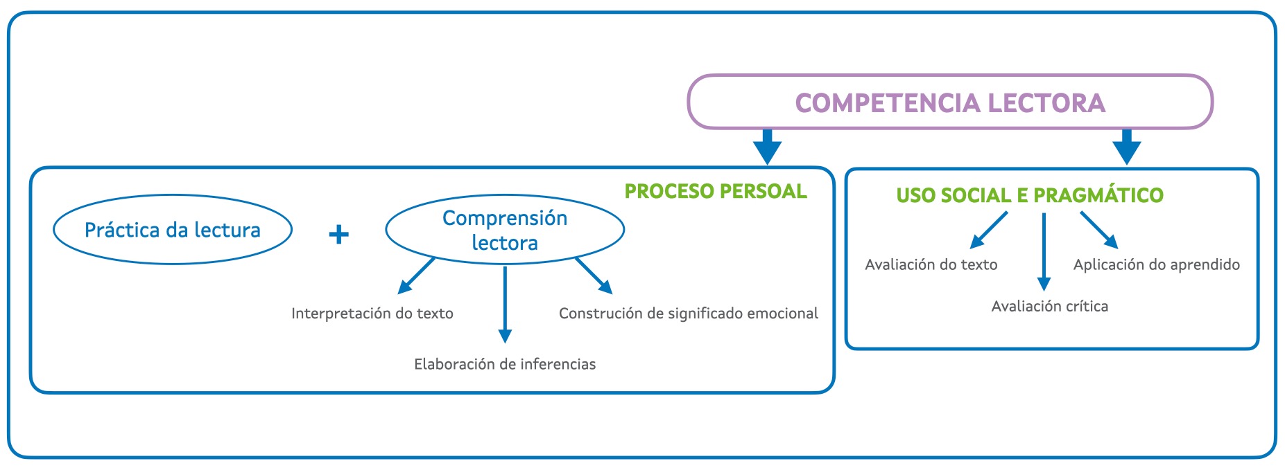 Mentres que a comprensión lectora se centra no individuo, a competencia lectora engade unha dimensión máis social e pragmática, vinculada á capacidade de aplicar o comprendido na vida cotiá. Dese xeito, a comprensión lectora céntrase en procesos da persoa tales como a realización de inferencias, a interpretación e a construción de significado. A competencia lectora inclúe todo isto e, ademais, amplíase a outros aspectos, como a reflexión crítica, a avaliación do texto e a aplicación do aprendido no mesmo. En conclusión, entendemos que un lector competente o é porque ten capacidade de descifrar, comprender e interpretar o escrito en toda a súa magnitude —desde o literal ata o inferencial ou simbólico —, reflexionar sobre iso, unilo e comparalo con outros coñecementos adquiridos, e utilizar o aprendido en relación con diferentes ámbitos da vida.
