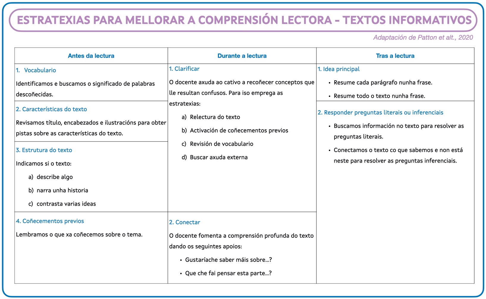 Unha das intervencións fundamentais en relación coa comprensión lectora consiste en dotar o alumnado de estratexias para desenvolver a comprensión literal (información explícita) e a comprensión inferencial (información implícita).