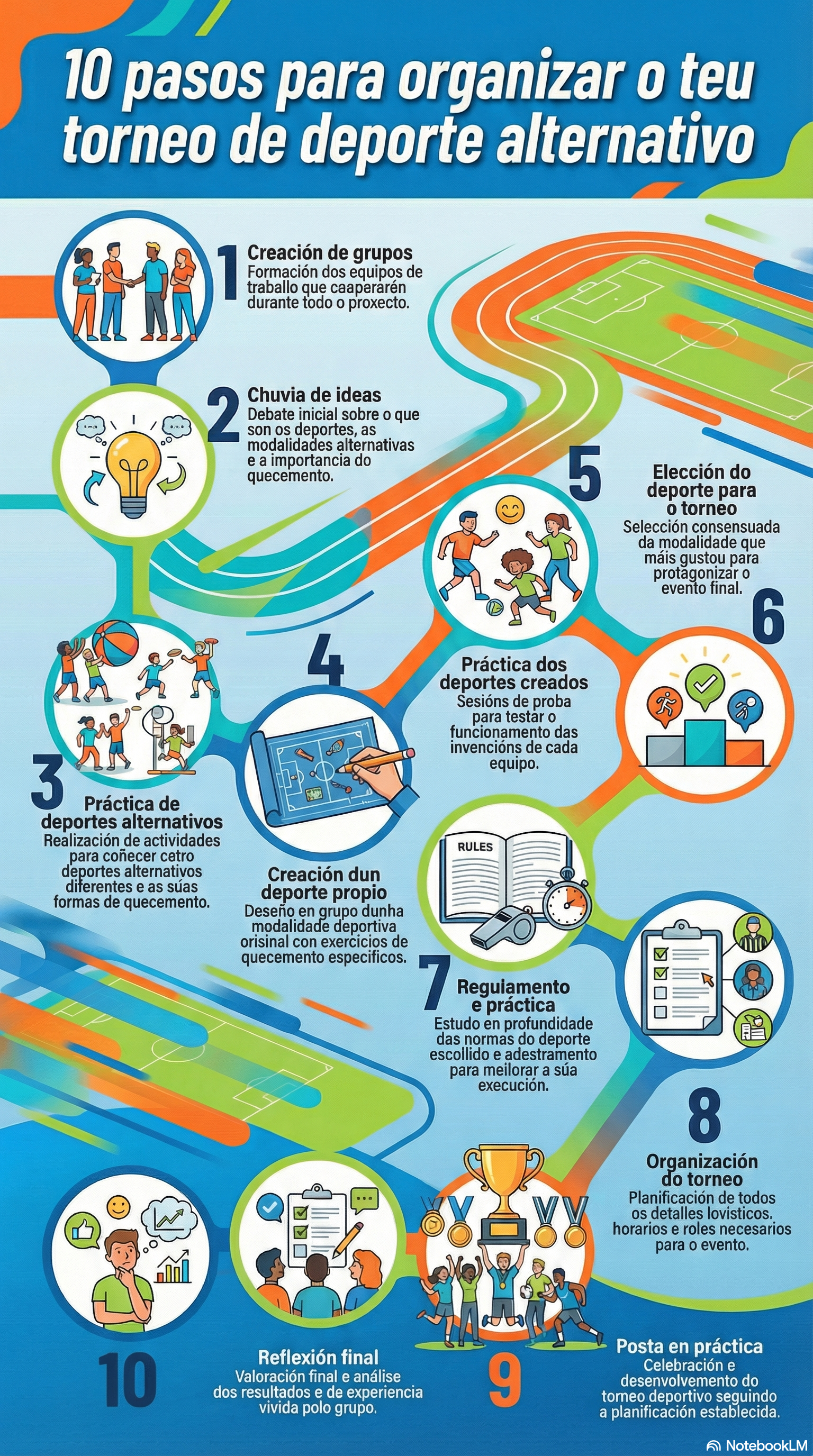 Esta situación de aprendizaxe propón un reto que consiste en inventar novos deportes para, posteriormente, organizar un torneo deportivos dos deportes creados. O obxectivo é crear/inventar un xogo predeportivo alternativo por parte do alumnado co obxectivo de descubrir novas formas de xogar e non caer sempre nos mesmos recursos lúdicos. Trátase dun exemplo de prácticas de introdución da IA na elaboración de recurso para a materia de EF |