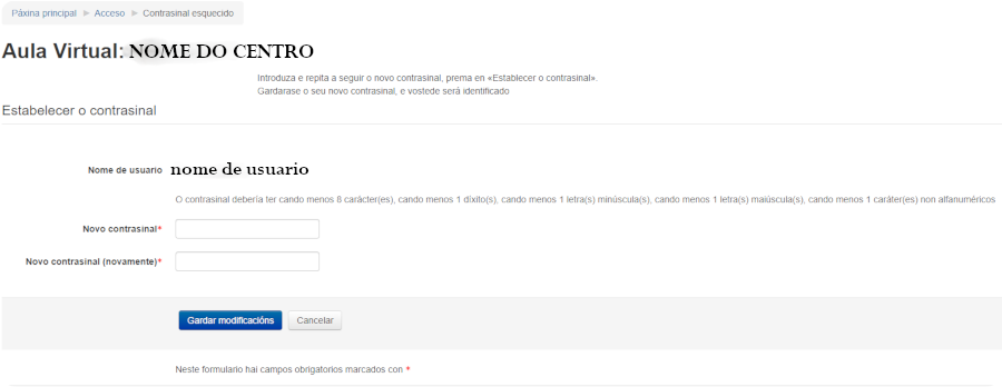 - Preme na ligazón que se envía ou copiaa e pegaa no navegador, antes de 30 minutos, amósase a seguinte páxina onde tes que introducir o novo contrasinal e premer en Gardar modificacións