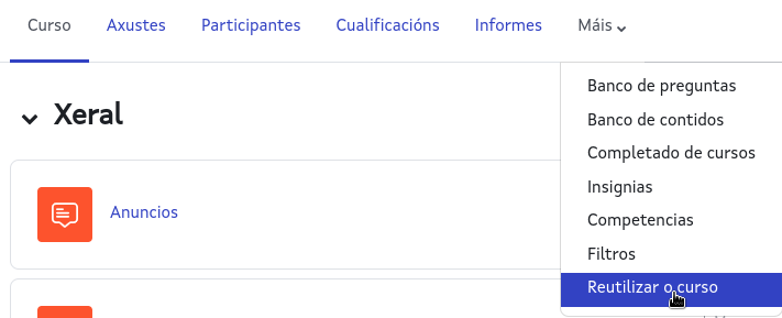 - No tema Boost: Menú Máis, Reutilizar o curso; No despregable escoller Copia de seguridade.