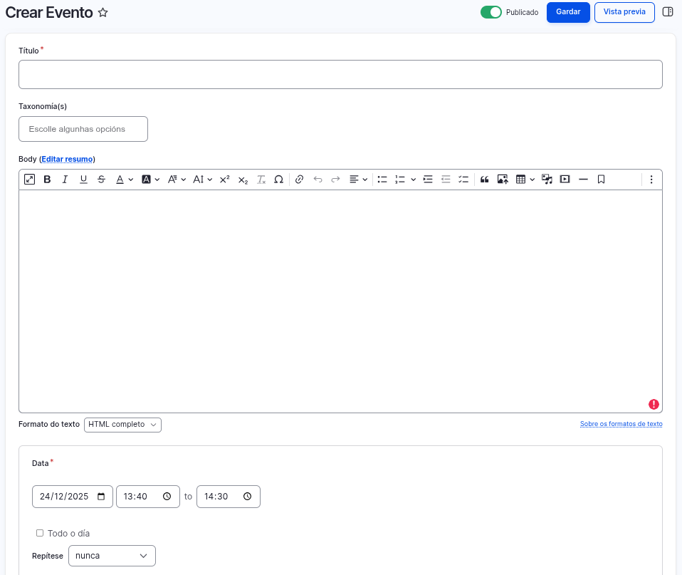 Na seguinte imaxe podemos ver a ficha de creación dun contido tipo evento: