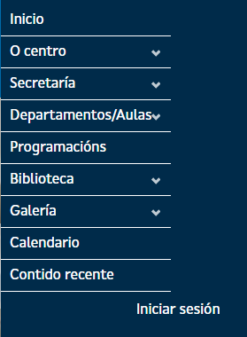 Na parte inferior do logo, atópase o menú principal do sitio web con elementos despregables. Este menú é configurable segundo se especifica na documentación. Por defecto incorpora os seguintes elementos: