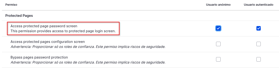 - O permiso Access protected pages configuration screen permite establecer os roles que poderán crear páxinas protexidas.