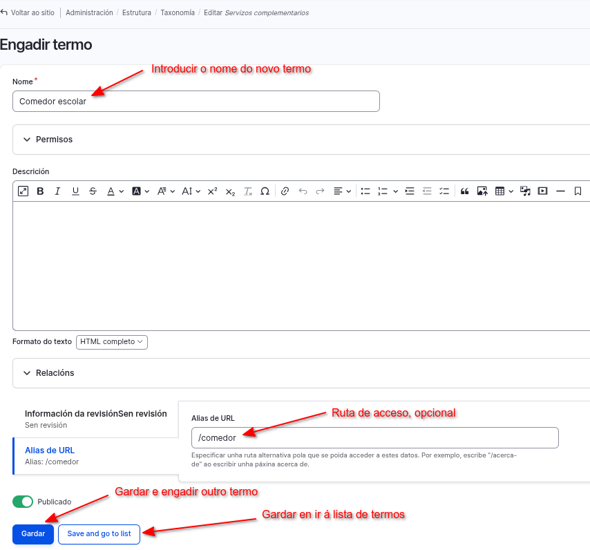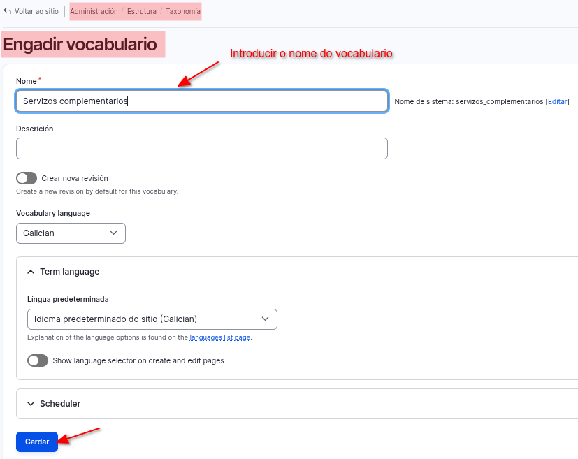 • No campo obrigatorio Nome* especificar o nome desexado para o vocabulario: Servizos complementarios