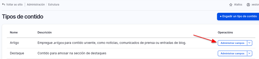 • Para o tipo de contido Artigo premer no botón Administrar campos