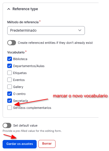 • Nese novo formulario de Configuración de Taxonomía(s) para Artigo marcar o novo vocabulario.