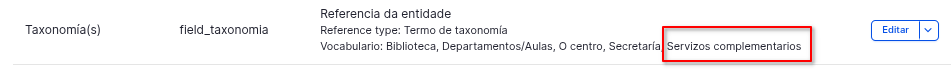 Por esta razón, ao intentar agregar/editar un contido de calquera tipo (páxina básica, artigo, destaque ou evento), inicialmente no formulario de creación/edición non se amosará o vocabulario Servizos complementarios no despregable Taxonomía.