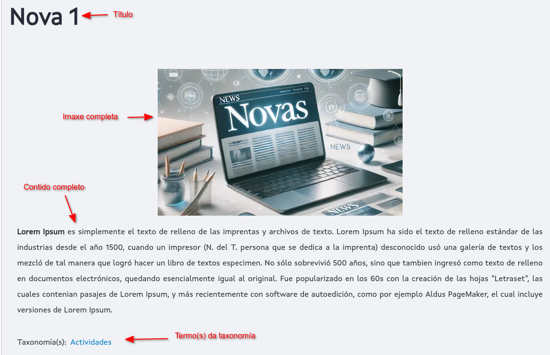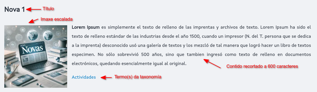 - Corpo: Contido do destaque, ao que se accederá ao premer sobre a imaxe ou o título, accedendo deste xeito ao contido completo.